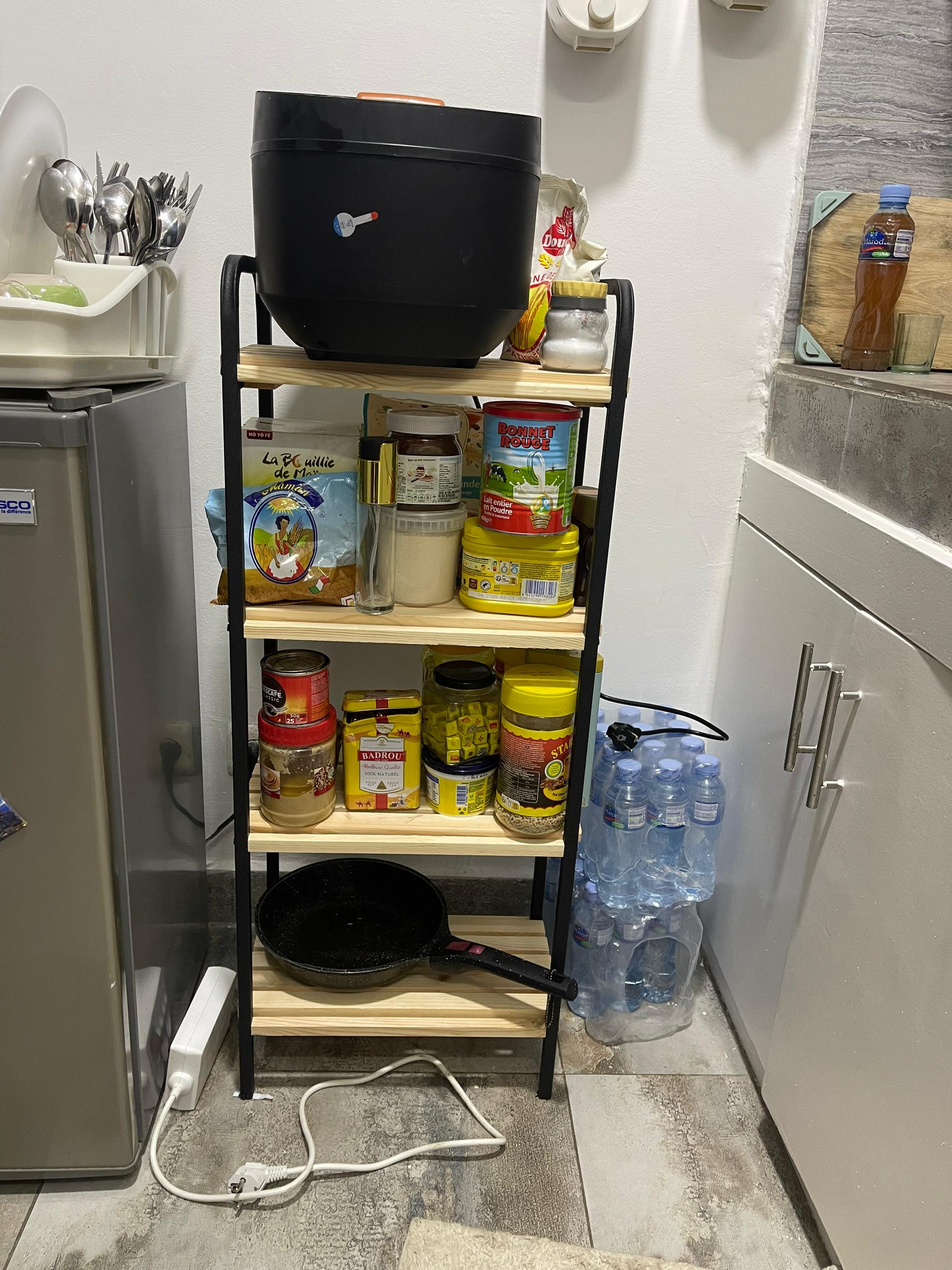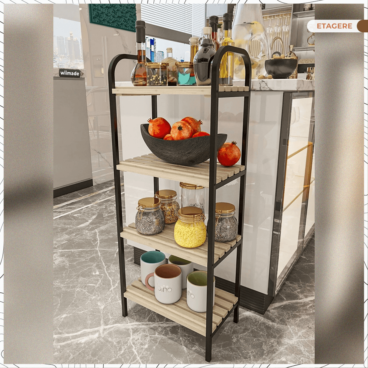 4 niveaux ✅Matière : Étagères en bois naturel, structure en métal ✅Résistant à l'eau et à l'humidité, facile à nettoyer. ✅Démontable, Anti rayures et antidérapants. ✅ Hauteur : 98cm, Hauteur entre étagères : 24 CM ✅ Longueur : 39 CM, Largueur : 22 CM